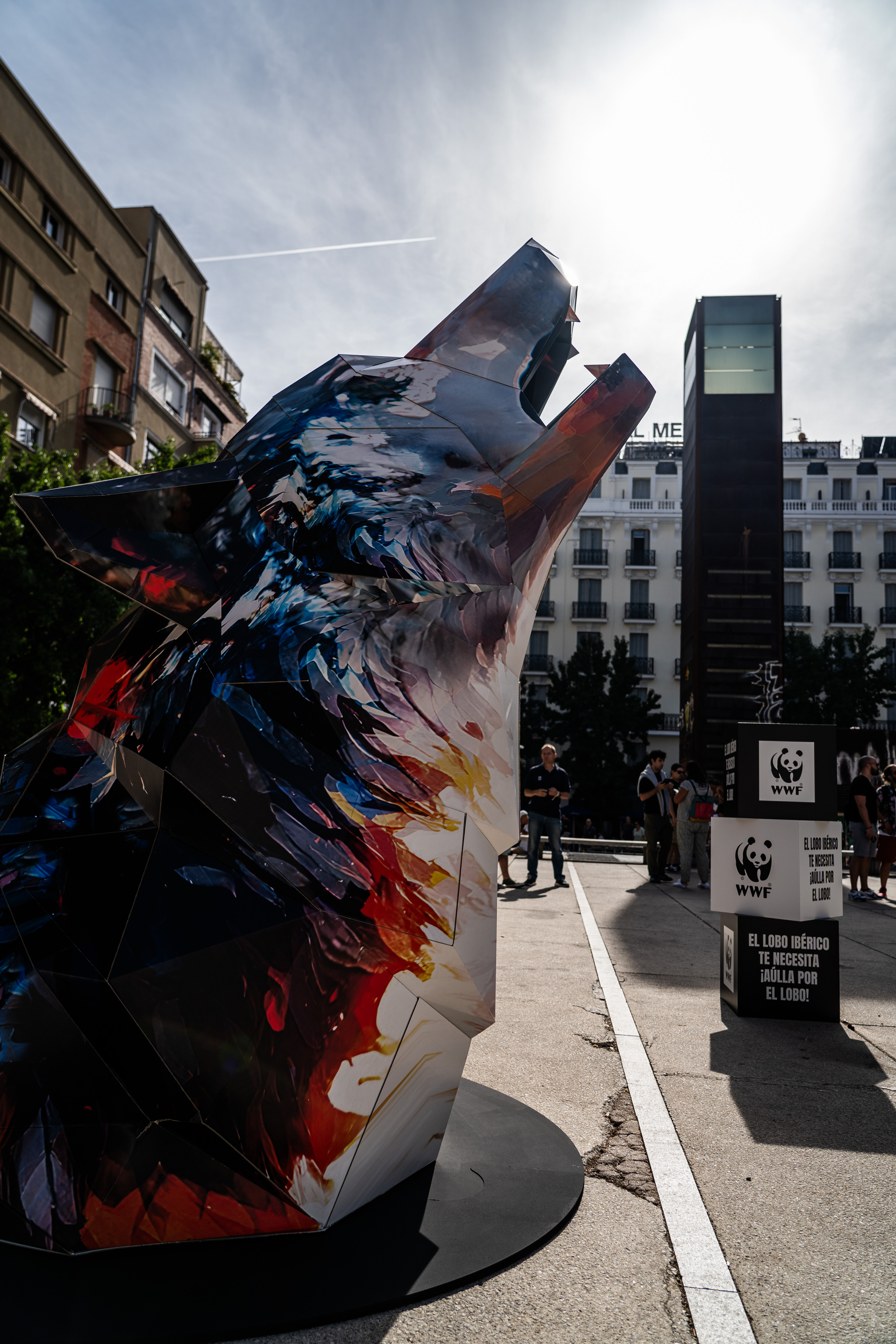 Hemos instalado hoy en pleno centro de Madrid una escultura gigante de la cabeza de un lobo ibérico (de 2,5 metros de altura y 3 metros de base) para denunciar la precaria situación a la que se enfrenta esta especie emblemática en nuestro país.