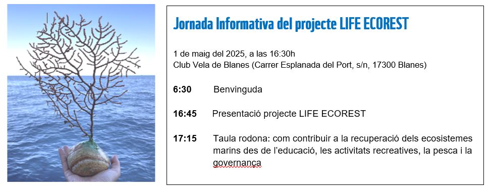El projecte LIFE ECOREST té l’objectiu de restaurar prop de 30.000 hectàrees d’hàbitats marins profunds a Catalunya en zones de gran valor ecològic al llarg del litoral de Girona i Barcelona amb la participació activa del sector pesquer. Es preveu que la restauració es realitzi en 14 zones de protecció pesquera amb alta concentració d’espècies amenaçades o vulnerables, entre les que es troben gorgònies, coralls negres y varies espècies d’esponges de mar. Vols saber més sobre aquest projecte? Vine a les jornades informatives